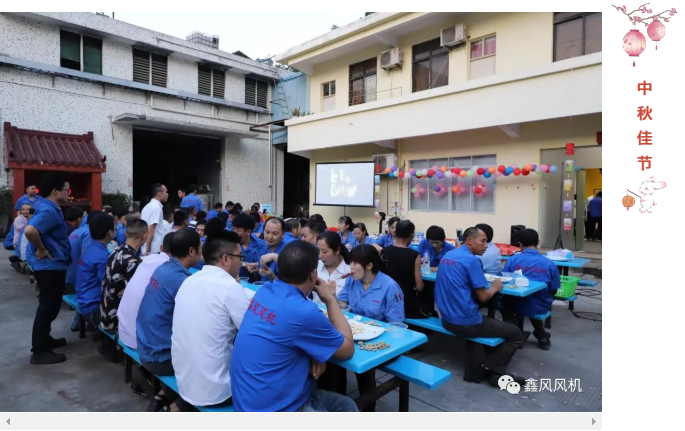2019年9月10日,在這個象征長長久久的日子里,鑫風(fēng)風(fēng)機(jī)全體家人歡聚一堂,共度佳節(jié),歡慶這美好的中秋之夜。